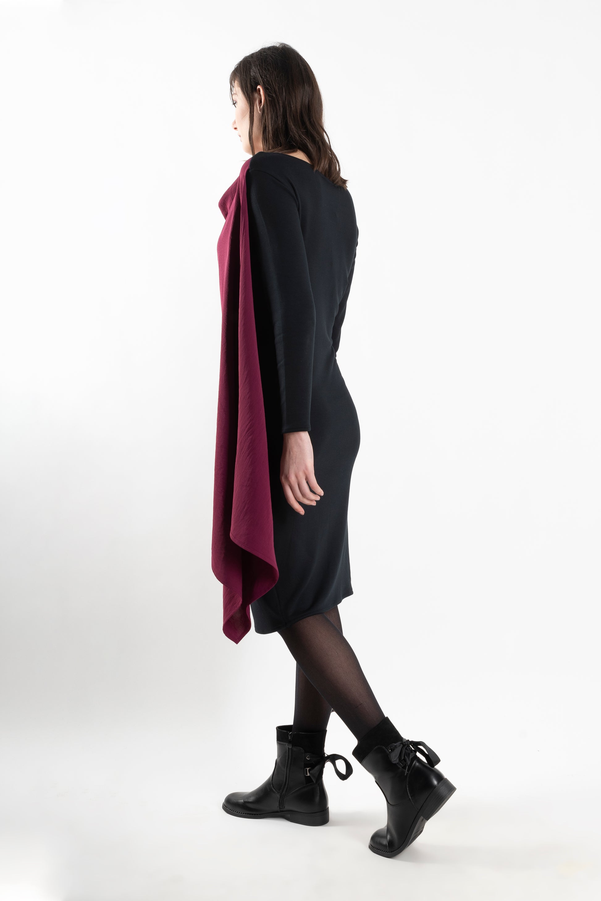 An elegant loose-fit dress with a distinctive cowl neckline and fluid lines. Its airy cut enhances freedom of movement, making it the perfect choice for day-to-night styling with a modern edge.