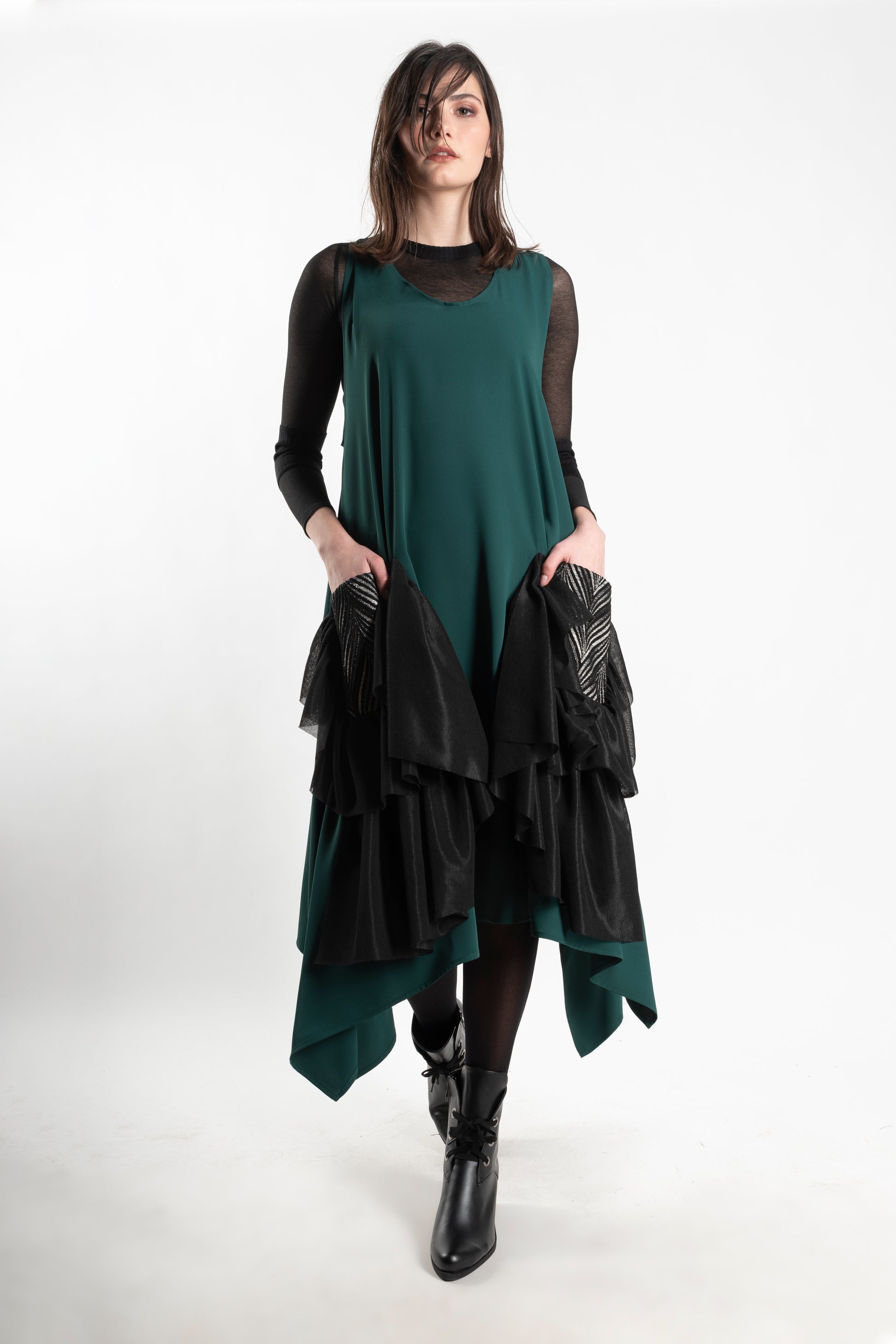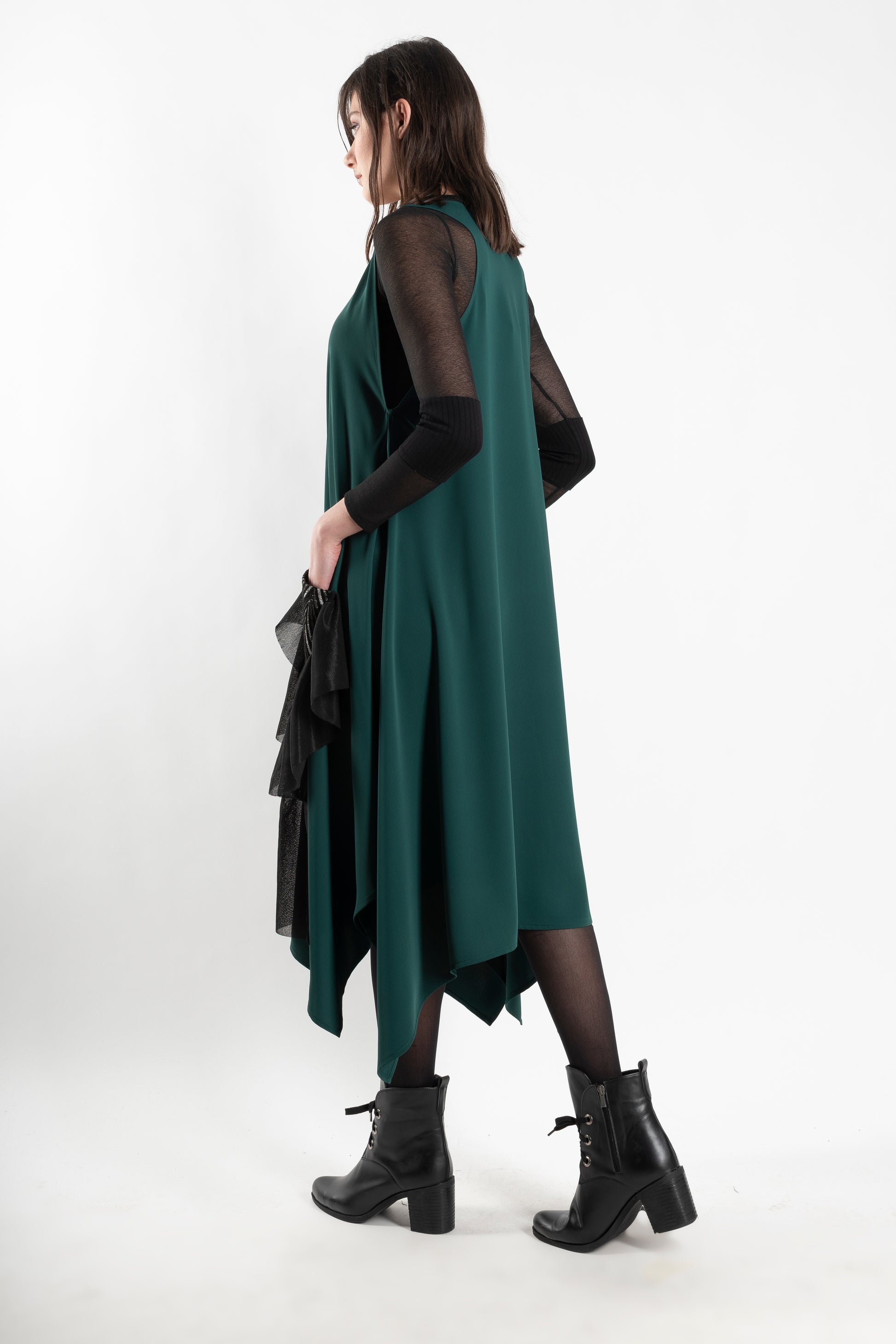 A contemporary dress with a free-flowing cut and architectural lines. Perfect for layering or standing out on its own, it’s an effortlessly chic choice for the modern wardrobe.