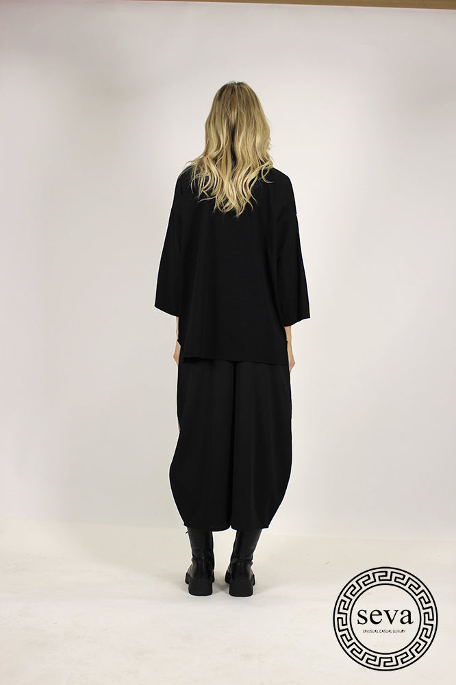 This contemporary tunic blends structure and softness with an avant-garde edge. The design features a bold asymmetrical overlay in a cool taupe tone, creating a sculptural contrast against the sleek black base. Wide 3/4 sleeves add relaxed elegance, while the flowing silhouette ensures effortless movement. Modern, artistic, and endlessly versatile, this tunic is a statement piece perfect for layering or wearing as the star of the outfit.