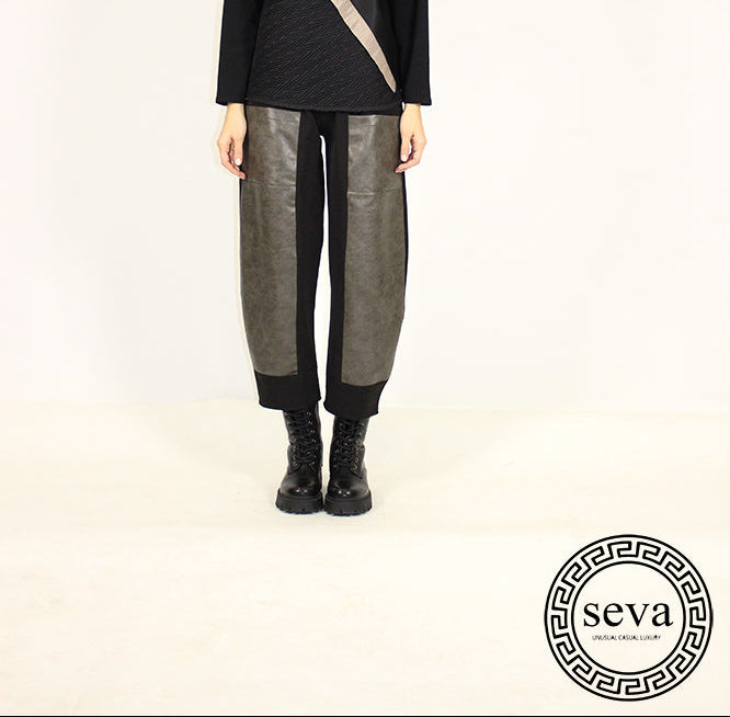 These statement pants showcase a bold, sculptural design that blends modern texture with striking contrast. The front panels feature a structured, leather-like grey finish, creating a powerful visual impact against the slimming black side and back panels. The tapered cut and cuffed hems add a contemporary edge, while the relaxed fit offers comfort without compromising style. Perfect for anyone who loves fashion with attitude—sleek, artistic, and unapologetically unique.