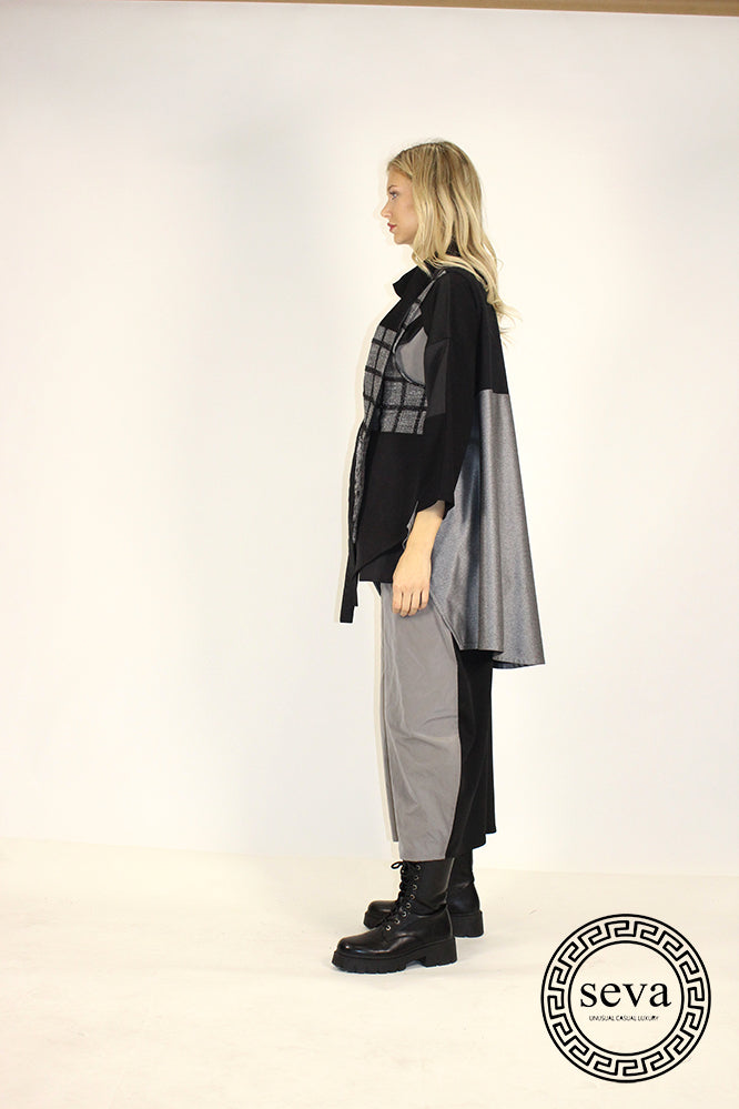 Artistic and full of character, this mixed-texture jacket blends geometric patterns with fluid draping for a uniquely modern look. The patchwork-style front panel features soft greys and bold black checks, creating depth and visual intrigue. Wide sleeves and a relaxed silhouette add effortless movement, while the tie-front detail allows for subtle shaping. A standout layering piece that brings contemporary elegance to any outfit.