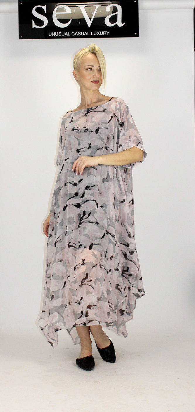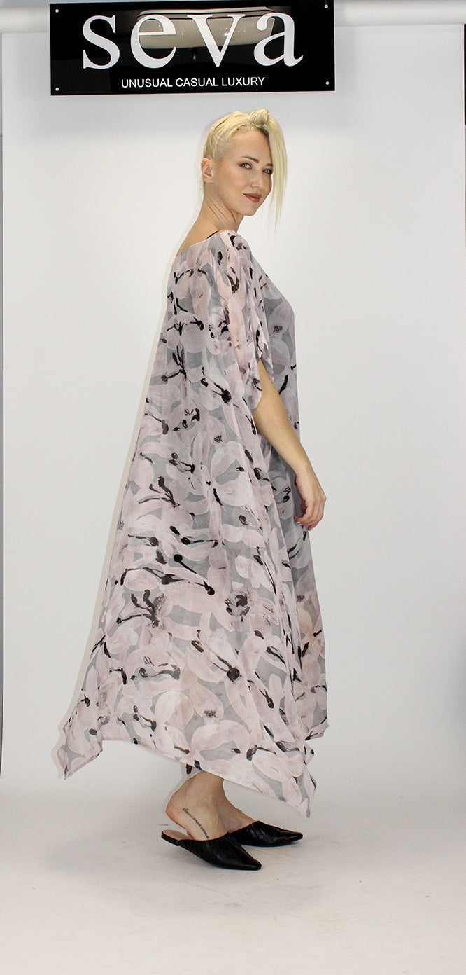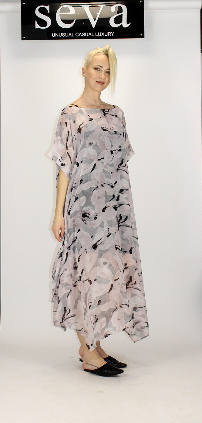 Romantic and effortlessly refined, this flowing kaftan dress by Seva is a dreamy blend of artistry and comfort. Crafted in a featherweight sheer fabric, it features an abstract floral print in soft blush tones with charcoal accents—like a watercolor painting brought to life. The airy silhouette, wide boat neckline, and loose short sleeves create a breezy feel that moves with grace. Perfect for summer soirées, art openings, or a chic holiday escape, this piece invites you to express your style with poise and ease.