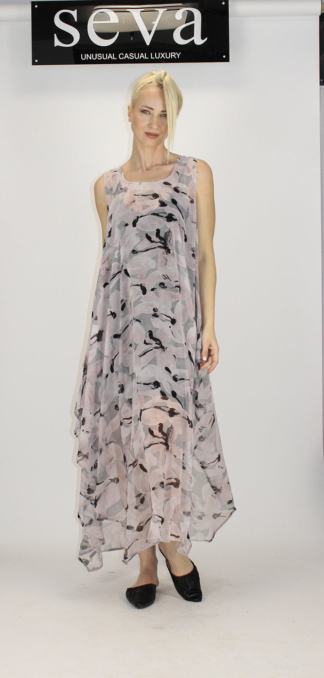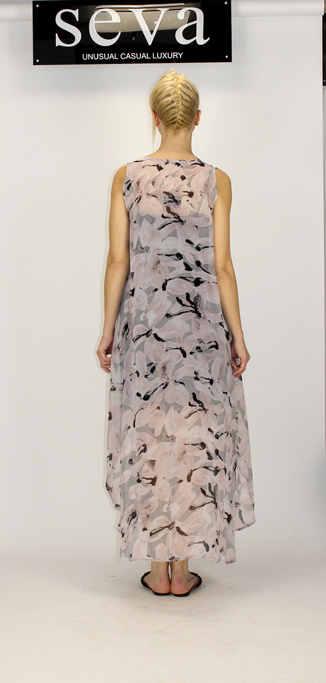 Breezy elegance meets modern femininity in this sleeveless printed maxi dress from Seva. Featuring the same dreamy abstract floral motif in blush, grey, and black hues as its kaftan counterpart, this version is reimagined with a minimalist sleeveless cut that flatters the shoulders and elongates the silhouette. The airy, asymmetric hem flows with every step, while the lightweight sheer fabric adds a delicate, ethereal quality. Ideal for sunlit afternoons, summer parties, or artful layering—this piece is your go-to for relaxed sophistication with a creative twist.